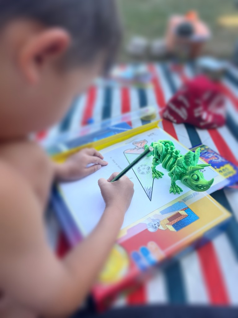 The assignment helped children express themselves and feel more at home. That afternoon, we sat on the Mat at swimming pool ground as he proudly drew Dino, candies, pencils, and said, “And the round chocolate you hid inside!”